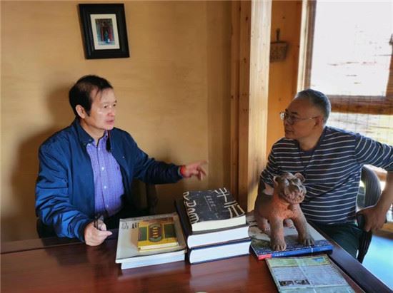 图为洪加祥自己案头与好友畅谈诗词写作。