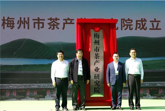 ▲中国工程院院士陈宗懋、刘仲华,广东省农业农村厅厅长顾幸伟,梅州市市长张爱军为梅州市茶产业研究所揭牌。